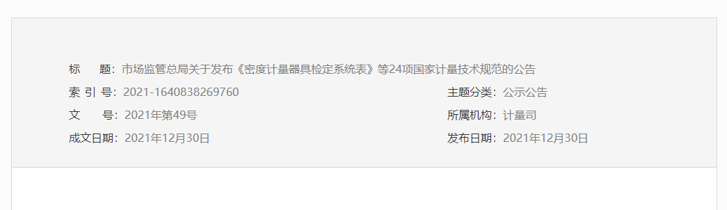 近日,市場監(jiān)管總局關于發(fā)布《密度計量器具檢定系統(tǒng)表》等24項國家計量技術規(guī)范的公告: