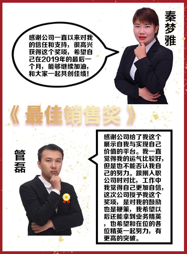 全體員工合唱普天之歌,拉開此次表彰大會序幕。岳總經(jīng)理向業(yè)務(wù)一部秦夢雅和業(yè)務(wù)二部管磊表示祝賀及感謝,兩位業(yè)務(wù)精英也發(fā)表了自己的獲獎感言。