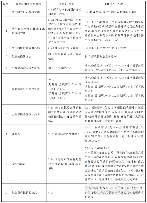 新標(biāo)準(zhǔn)在顆粒物過(guò)濾效率檢測(cè)方法(檢測(cè)設(shè)備分辨率、顆粒物粒徑的換算方法、KP過(guò)濾元件過(guò)濾效率加載測(cè)試終點(diǎn)判斷方法)、泄露性的檢測(cè)方法、呼吸阻力的檢測(cè)方法、呼吸阻力的技術(shù)要求、呼氣閥氣密性的技術(shù)要求和檢測(cè)方法、呼氣閥保護(hù)裝置的名稱、死腔的檢測(cè)方法、半面罩視野的技術(shù)要求、全面罩視野的技術(shù)要求、全面罩鏡片的技術(shù)要求、可燃性、清洗和消毒、制造商應(yīng)提供的信息、使用性能、頭帶測(cè)試方法等方面的要求都進(jìn)一步細(xì)化。