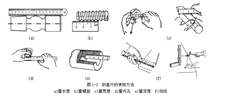 鋼直尺用于測量零件的長度尺寸(圖1-2),它的測量結果不太準確。這是由于鋼直尺的刻線間距為1mm,而刻線本身的寬度就有0.1~0.2mm,所以測量時讀數誤差比較大,只能讀出毫米數,即它的最小讀數值為1mm,比1mm小的數值,只能估計而得。