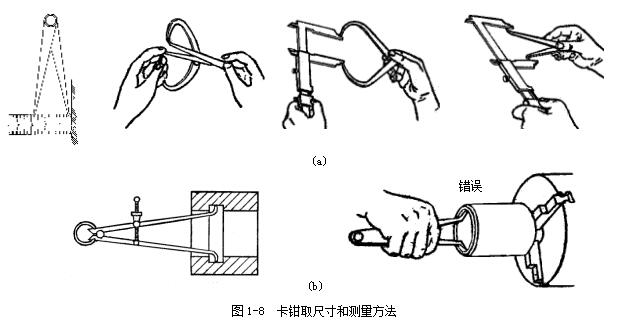 用巳在鋼直尺上或在外卡鉗上取好尺寸的內卡鉗去測量內徑,圖1-8a 所示。就是比較內卡鉗在零件孔內的松緊程度。如內卡鉗在孔內有較大的自由擺動時,就表示卡鉗尺寸比孔徑內小了;如內卡鉗放不進,或放進孔內后緊得不能自由擺動,就表示內卡鉗尺寸比孔徑大了,如內卡鉗放入孔內,按照上述的測量方法能有1~2mm的自由擺動距離,這時孔徑與內卡鉗尺寸正好相等。測量時不要用手抓住卡鉗測量,圖1-8b 所示,這樣手感就沒有了,難以比較內卡鉗在零件孔內的松緊程度,并使卡鉗變形而產生測量誤差。