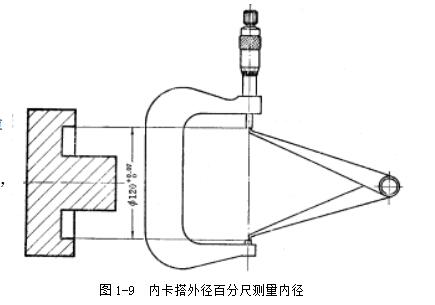 也能分辨得出。又如用內(nèi)卡鉗與外徑百分尺聯(lián)合測(cè)量內(nèi)孔尺寸時(shí),有經(jīng)驗(yàn)的老師傅完全有把握用這種方法測(cè)量高精度的內(nèi)孔。這種內(nèi)徑測(cè)量方法,稱為“內(nèi)卡搭百分尺”,是利用內(nèi)卡鉗在外徑百分尺上讀取準(zhǔn)確的尺寸,如圖1-9所示,再去測(cè)量零件的內(nèi)徑;或內(nèi)卡在孔內(nèi)調(diào)整好與孔接觸的松緊程度,再在外徑百分尺上讀出具體尺寸。這種測(cè)量方法,不僅在缺少精密的內(nèi)徑量具時(shí),是測(cè)量內(nèi)徑的好辦法,而且,對(duì)于某零件的內(nèi)徑,如圖1-9所示的零件,由于它的孔內(nèi)有軸而使用精密的內(nèi)徑量具有困難,則應(yīng)用內(nèi)卡鉗搭外徑百分尺測(cè)量內(nèi)徑方法,就能解決問題。