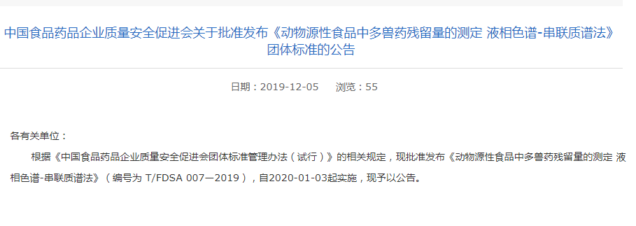 近日,中國食品藥品企業質量安全促進會發布了關于《動物源性食品中多獸藥殘留量的測定 液相色譜-串聯質譜法》團體標準的公告。公告中稱,該標準將于2020年1月3號正式實施。