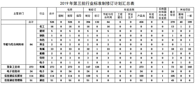 2019年第三批標(biāo)準(zhǔn)修制訂計(jì)劃共安排項(xiàng)目計(jì)劃526項(xiàng),其中制定394項(xiàng)、修訂132項(xiàng);重點(diǎn)專項(xiàng)標(biāo)準(zhǔn)279項(xiàng)、基礎(chǔ)公益類標(biāo)準(zhǔn)48項(xiàng)、一般標(biāo)準(zhǔn)199項(xiàng);產(chǎn)品類標(biāo)準(zhǔn)456項(xiàng)、工程建設(shè)標(biāo)準(zhǔn)6項(xiàng)、節(jié)能與綜合利用標(biāo)準(zhǔn)64項(xiàng)。這526項(xiàng)標(biāo)準(zhǔn)皆為推薦性質(zhì),涉及了化工、建材、鋼鐵、有色、黃金、機(jī)械、船舶、紡織、電子、通信等行業(yè)。無疑,這批標(biāo)準(zhǔn)的修制訂將是對標(biāo)準(zhǔn)化體系的進(jìn)一步完善,能有效促進(jìn)我國標(biāo)準(zhǔn)化水平的提升,同時(shí)也將推動(dòng)行業(yè)的高質(zhì)量發(fā)展和創(chuàng)新發(fā)展。