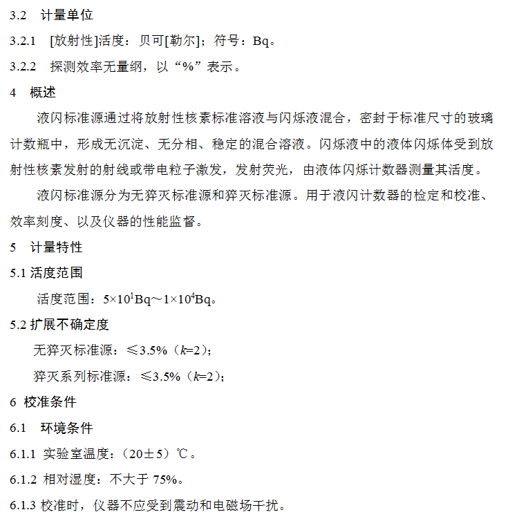 《液閃標(biāo)準(zhǔn)源校準(zhǔn)規(guī)范》(征求意見(jiàn)稿)適用于活度范圍為5×101Bq~1×104Bq液閃標(biāo)準(zhǔn)源的校準(zhǔn),液閃標(biāo)準(zhǔn)源包括無(wú)猝滅標(biāo)準(zhǔn)源以及猝滅系列標(biāo)準(zhǔn)源。