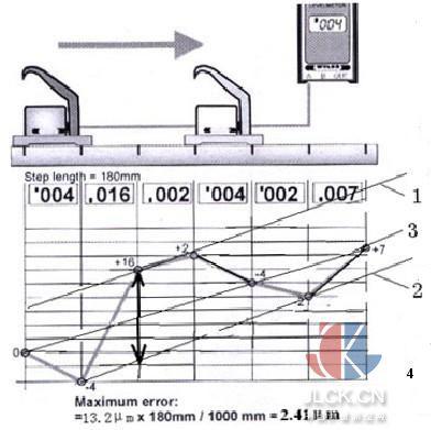 利用數(shù)顯式電子水平儀逐檔測量導軌的直線度,步距l(xiāng)有150mm, 180mm,200mm等。第一檔0-l,第二檔l-2l;并逐檔將讀數(shù)記錄下來。但取數(shù)后,進行計算或作坐標圖時,各類專業(yè)書上所采用的方法差別較大,常用的為作圖法和計算法。