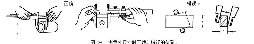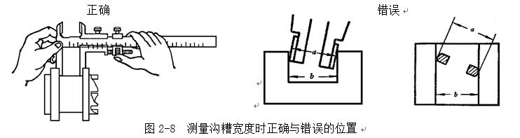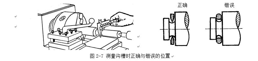 測量溝槽時,應當用量爪的平面測量刃進行測量,盡量避免用端部測量刃和刀口形量爪去測量外尺寸。而對于圓弧形溝槽尺寸,則應當用刃口形量爪進行測量,不應當用平面形測量刃進行測量,如2-7所示。