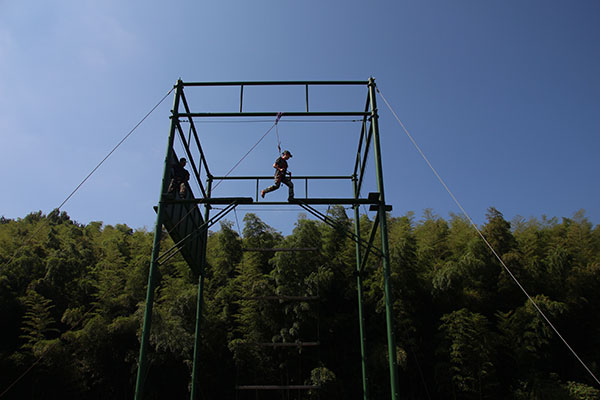 高空斷橋”。隊(duì)員將爬上一個(gè)8米高的斷橋,從一端跳到另一端并返回。