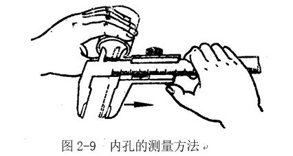 4 當測量零件的內(nèi)尺寸時:圖2-9所示。要使量爪分開的距離小于所測內(nèi)尺寸,進入零件內(nèi)孔后,再慢慢張開并輕輕接觸零件內(nèi)表面,用固定螺釘固定尺框后,輕輕取出卡尺來讀數(shù)。取出量爪時,用力要均勻,并使卡尺沿著孔的中心線方向滑出,不可歪斜,免使量爪扭傷;變形和受到不必要的磨損,同時會使尺框走動,影響測量精度。