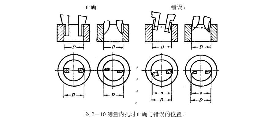 卡尺兩測量刃應在孔的直徑上,不能偏歪。圖2-10為帶有刀口形量爪和帶有圓柱面形量爪的游標卡尺,在測量內(nèi)孔時正確的和錯誤的位置。當量爪在錯誤位置時,其測量結(jié)果,將比實際孔徑D要小。